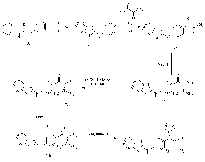The cyclization of 1,3-diphenylthiourea (I) with Br2 and HBr in water gives N-(benzothiazol-2-yl)-N-phenylamine (II), which is condensed with 2-chloropropionyl chloride (III) by means of AlCl3 in dichloromethane to yield the propiophenone (IV). The reaction of (IV) with dimethylamine in isopropanol affords the racemic alpha-(dimethylamino) propiophenone (V), which is optically resolved by means of (+)(D)-di-p-toluoyltartaric acid providing the (S)-enantiomer (VI) with a 80% ee. The reduction of (VI) with NaBH4 and NaOH in isopropanol gives the (S,S)-enantiomer (VII) with a 85% ee. Finally, this compound is condensed with CDI and imidazole to afford the target compound that is purified by crystallization in ethyl acetate up to a 99% ee.