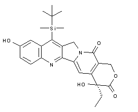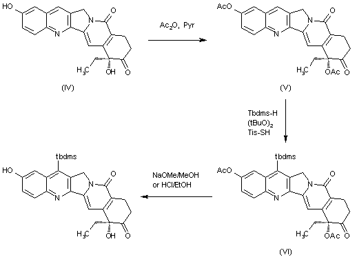 The reaction of 10-hydroxycamptothecin (IV) with Ac2O and pyridine gives the diacetate (V), which is silylated with Tbdms-H, (t-BuO)2 and Tis-SH in refluxing dioxane/TFA to give the silylated diacetate (VI). Finally, this compound is deacetylated by reaction with NaOMe in methanol or HCl in ethanol to afford the target silylated 10-hydroxycamptothecin.