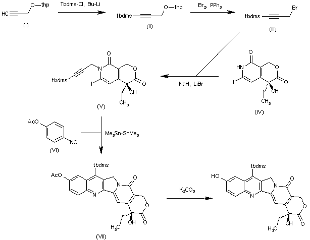 The reaction of the propargyl tetrahydropyranyl ether (I) with TBDMS-Cl and BuLi in THF gives the silylated acetylene (II), which is treated with Br2 and PPh3 to yield the silylated propargyl bromide (III). The reaction of (III) with the pyranopyridone (IV) by means of NaH and LiBr in DMF/DME affords the alkylated pyranopyridone (V), which is cyclized with 4-acetoxyphenyl isocyanide (VI) by means of hexamethyldistannane in refluxing benzene to provide the silylated acetoxycamptothecin (VII). Finally, this compound is deacetylated with K2CO3 in methanol.