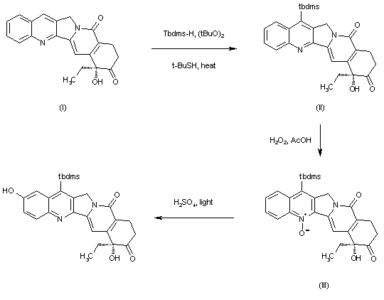 The reaction of camptothecin (I) with Tbdms-H, (t-BuO)2 and t-BuSH in refluxing dioxane gives the 7-silylcamptothecin (II), which is treated with H2O2 in hot AcOH to give the N-oxide (III). Finally, this compound is isomerized by photolysis in dioxane/H2SO4 to afford the target silylated 10-hydroxycamptothecin.