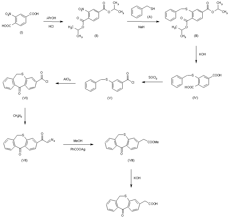 The esterification of 2-nitroterephthalic acid (I) with isopropanol by means of dry HCl gives the corresponding dusoproyl ester (II), which by reaction with benzylmercaptane by means of NaH in DMF yields diisopropyl 2-benzylthioterephthalate (III). This compound is hydrolyzed with KOH in refluxing methanol affording the correspon-ding acid (IV), which is converted into its diacid chloride (V) by treatment with refluxing SOCl2. The cyclization of (V) with AlCl3 in methylene chloride - nitromethane affords 6,11-dihydrodibenzo[b]thiepin-11-one-3-carbonyl chloride (VI), which is treated with diazomethane in ether - methylene chloride to yield the 3-diazoacetyl derivative (VII). The Arndt-Eister reaction of (VII) with silver benzoate in refluxing methanol affords methyl 6,11-dihydrodibenzo[b,e]thiepin-11-one-3-acetate (VIII), which is finally hydrolyzed with KOH in refluxing methanol.