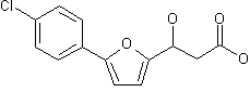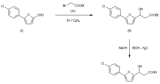 The condensation of 5-(4-chlorophenyl)-2-furaldehyde (I) with ethyl bromoacetate (A) by means of Zn in benzene gives ethyl 5-(4-chlorophenyl)-beta-hydroxy-2-furanpropanoate (II), which is then hydrolyzed with NaOH in refluxing aqueous ethanol.