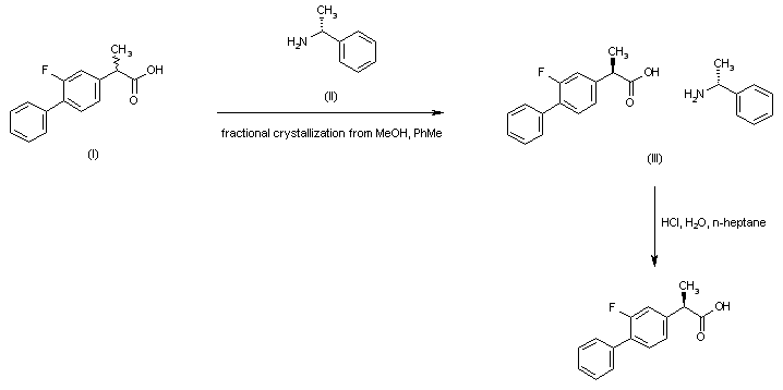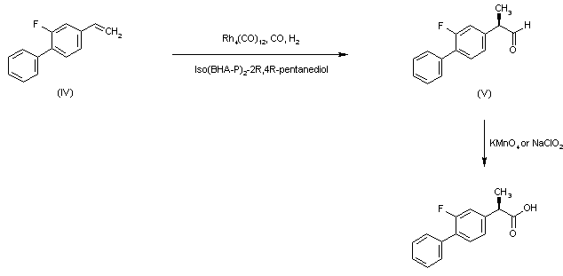 A different synthetic process consisted in the asymmetric olefin hydroformylation of 2-fluoro-4-vinylbiphenyl (IV) using a Rh4(CO)12 in the presence of the chiral catalyst (2R,4R)-di[2,2'-(3,3'-di-tert-butyl-5,5'-dimethoxy-1,1'-biphenyl)]-2,4-pentyl diphosphite under a pressurized atmosphere of CO/H2. The resultant chiral aldehyde (V) was further oxidized to the corresponding carboxylic acid employing several different oxidant reagents.
