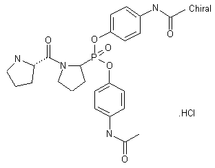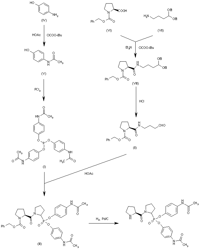 The cyclocondensation of triphenylphosphite (I) with 4-(benzyloxycarbonyl-L-prolylamino)butyraldehyde (II) in hot acetic acid gives the pyrrolidinylphosphonate (III), which is deprotected by hydrogenation with H2 over Pd/C in methanol. The intermediates (I) and (II) have been obtained as follows: Phosphite (I): The acylation of 4-aminophenol (IV) with acetic acid and isobutyl chloroformate in DMF gives N-(4-hydroxyphenyl)acetamide (V), which is allowed to react with PCl3 and triethylamine in DMF yielding phosphite (I). 4-(Benzyloxycarbonyl-L-prolylamino)butyraldehyde (II): The condensation of N-(benzyloxycarbonyl)-L-proline (VI) with 4-aminobutyraldehyde diethylacetal (VII) by means of isobutyl chloroformate and triethylamine in chloroform gives 4-[N-(benzyloxycarbonyl)-L-prolylamino]butyraldehyde diethylacetal (VIII), which is hydrolyzed to the target aldehyde (II) with HCl in THF.