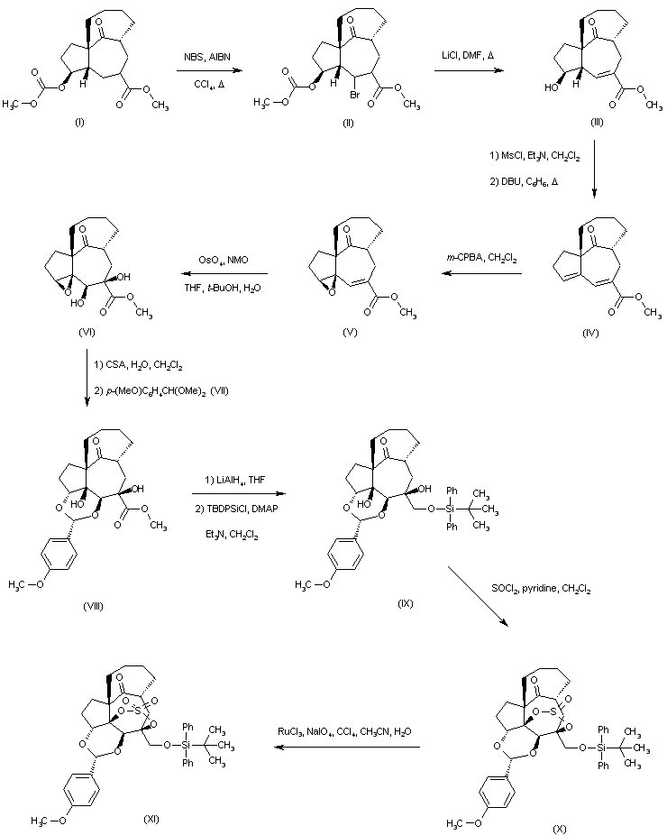 | 合成路线图解说明: The known photoaddition-fragmentation product (I) was brominated with N-bromosuccinimide in the presence of AIBN to afford bromoester (II), which upon treatment with LiCl in refluxing DMF produced the unsaturated ester (III) with concomitant removal of the methyl carbonate. Subsequent mesylation of the hydroxyl group of (III), followed by elimination with DBU in boiling benzene led to the formation of the diene ester (IV). Selective epoxidation of (IV) with m-chloroperbenzoic acid yielded the epoxy-unsaturated ester (V), which was oxidized with OsO4 and N-methylmorpholine-N-oxide to the epoxy diol (VI). Reaction of (VI) with camphorsulfonic acid in wet CH2Cl2 gave the corresponding tetraol, which on exposure to p-anisaldehyde dimethyl acetal (VII) produced selectively the acetal (VIII). The reduction of the ester group of (VIII) with LiAlH4, followed by silylation with TBDPSi-Cl afforded the monosilylated compound (IX). The reaction of (IX) with SOCl2 in the presence of pyridine generated the cyclic sulfite ester (X), which was oxidized to sulfate (XI) using RuCl3 and NaIO4. |