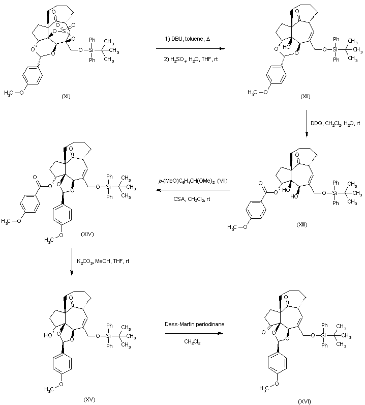 | 合成路线图解说明: Elimination of the sulfate of (XI) with DBU in refluxing toluene led, after acidic workup, to the formation of the allylic alcohol (XII). Oxidative cleavage of the p-methoxyphenyl acetal of (XII) with DDQ produced regioselectively the p-methoxybenzoate ester (XIII). Further treatment of (XIII) with p-anisaldehyde dimethyl acetal (VII) gave the acetal (XIV). Ester hydrolysis of (XIV), followed by oxidation of the resulting alcohol (XV) with Dess-Martin periodinane afforded ketone (XVI). |