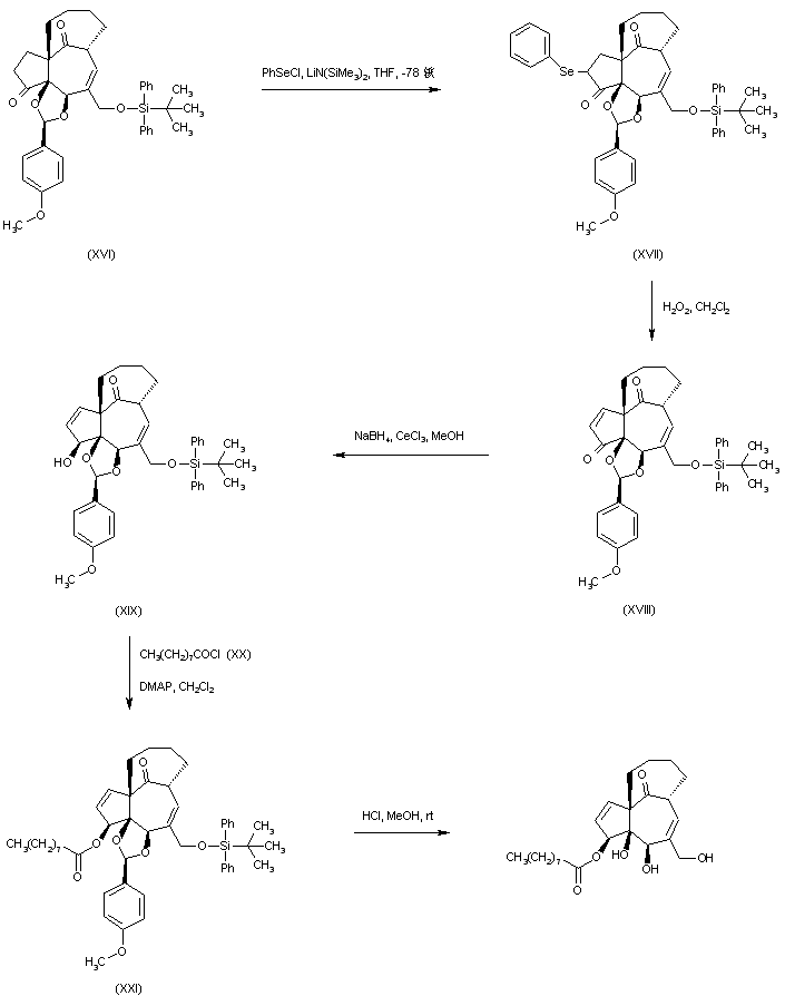 | 合成路线图解说明: Ketone (XVI) was treated with phenylselanyl chloride and LHMDS yielding the selenium derivative (XVII). Enone (XVIII) was then produced by oxidative elimination of the selenide (XVII). Reduction of the unsaturated ketone (XVIII) with NaBH4 in the presence of CeCl3 gave the 3-beta-allylic alcohol (XIX). This was acylated with nonanoyl chloride (XX) to afford ester (XXI). Finally, acid deprotection of the silyl ether and the p-methoxyphenyl acetal of (XXI) furnished the title compound. |