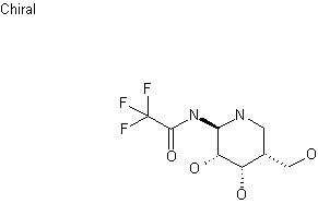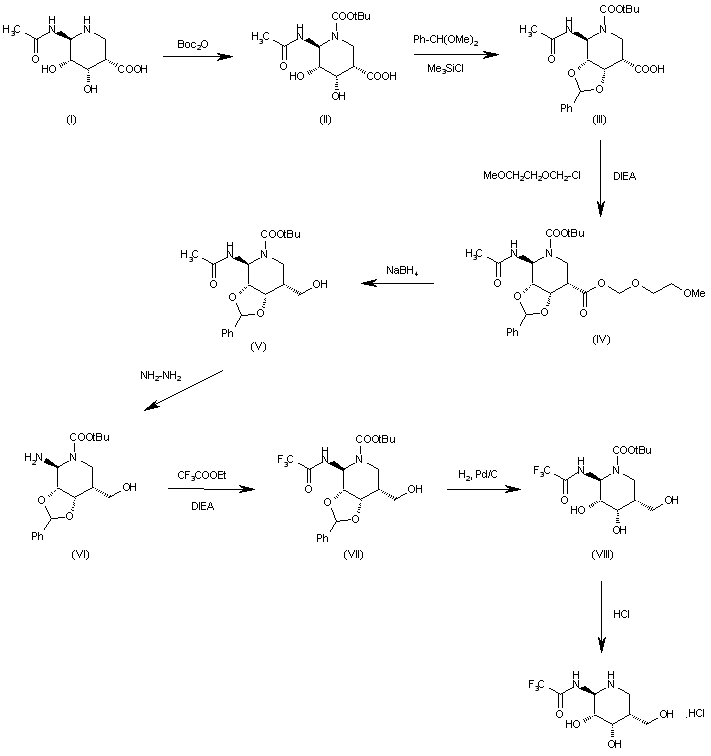 The protection of the NH group of siastatin B (I) with tert-butoxycarbonyl anhydride gives the N-protected intermediate (II), which is treated with benzaldehyde diethyl acetal and trimethylchlorosilane yielding the benzylidene ketal (III). The esterification of (III) with chloromethyl(2-methoxyethyl)ether and DIEA in DMF affords the activated ester (IV), which is reduced with NaBH4 in trifluoroethanol/THF giving the carbinol (V). The deacetylation of (V) with hot hydrazine yields the 2-aminopiperidine (VI), which is treated with ethyl trifluoroacetate and DIEA in hot DMF to afford the trifluoroacetamide (VII). The debenzylation of the cyclic ketal of (VII) with H2 over Pd/C in methanol gives the protected intermediate (VIII), which is finally deprotected with 4N HCl in hot dioxane.