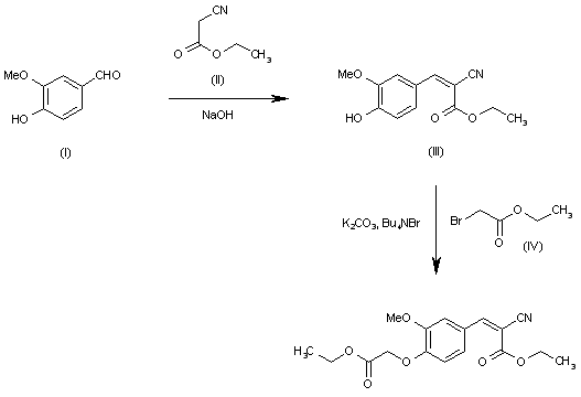 The condensation of 4-hydroxy-3-methoxybenzaldehyde (I) with ethyl cyanoacetate (II) by means of NaOH in ethanol gives the 2-cyanopropenoate (III), which is then alkylated at the OH group with ethyl 2-bromoacetate (IV) by means of K2CO3 and tetrabutylammonium bromide in THF.