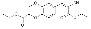 The condensation of 4-hydroxy-3-methoxybenzaldehyde (I) with ethyl cyanoacetate (II) by means of NaOH in ethanol gives the 2-cyanopropenoate (III), which is then alkylated at the OH group with ethyl 2-bromoacetate (IV) by means of K2CO3 and tetrabutylammonium bromide in THF.