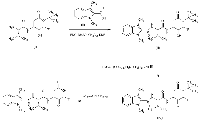 Coupling of 1,3-dimethylindole-2-carboxylic acid (II) with 5-fluoro-4-hydroxy-3-(valinylamino)pentanoic acid tert-butyl ester (I) using EDC in the presence of DMAP furnished amide (III). Subsequent Swern oxidation of the hydroxyl group of (III) gave ketone (IV). The tert-butyl ester of (IV) was finally cleaved by treatment with trifluoroacetic acid.