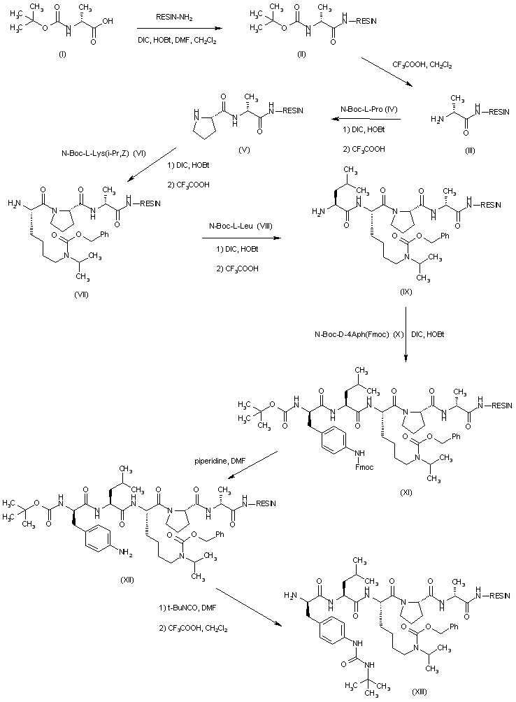 N-Boc-D-alanine (I) was coupled to the resin using diisopropyl carbodiimide and 1-hydroxybenzotriazole to afford resin (II). Subsequent cleavage of the Boc protecting group by means of trifluoroacetic acid provided the D-alanine-bound resin (III). Sequential coupling and deprotection cycles were carried out with the following protected amino acids: N-Boc-L-proline (IV), N-alpha-Boc-N6-isopropyl-N6-carbobenzoxy-L-lysine (VI) and N-Boc-L-leucine (VIII) to afford the respective peptide resins (V), (VII) and (IX). N-alpha-Boc-D-4-(Fmoc-amino)phenylalanine (X) was coupled to (IX), yielding resin (XI). Cleavage of the side-chain Fmoc protecting group with piperidine in DMF gave the aniline derivative (XII). After conversion to the corresponding urea by treatment with tert-butyl isocyanate, the Boc group was cleaved with trifluoroacetic acid to produce resin (XIII).