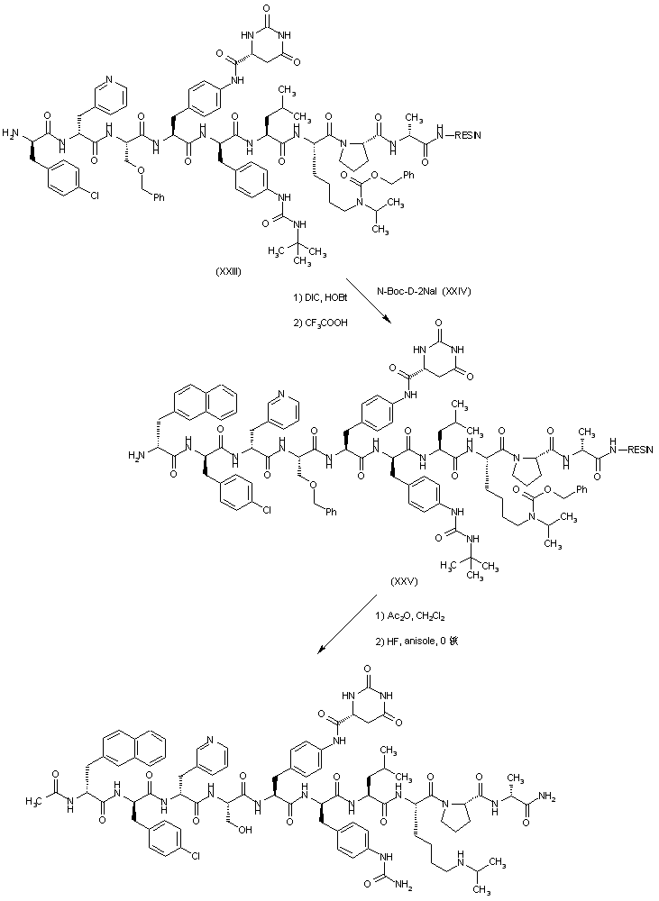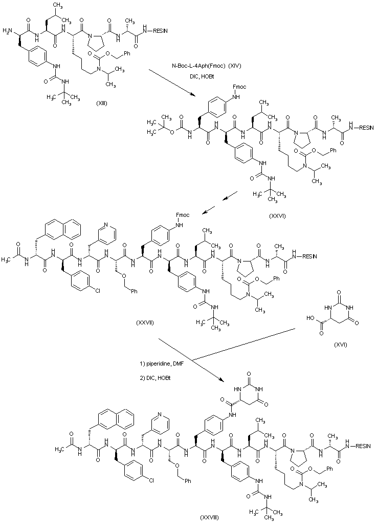 Peptide (XIX) was sequentially coupled with N-alpha-Boc-D-(3-pyridyl)alanine (XX) and N-Boc-D-(4-chlorophenyl)alanine (XXII) to furnish, after the corresponding deprotection cycles with TFA, the resins (XXI) and (XXIII), respectively.