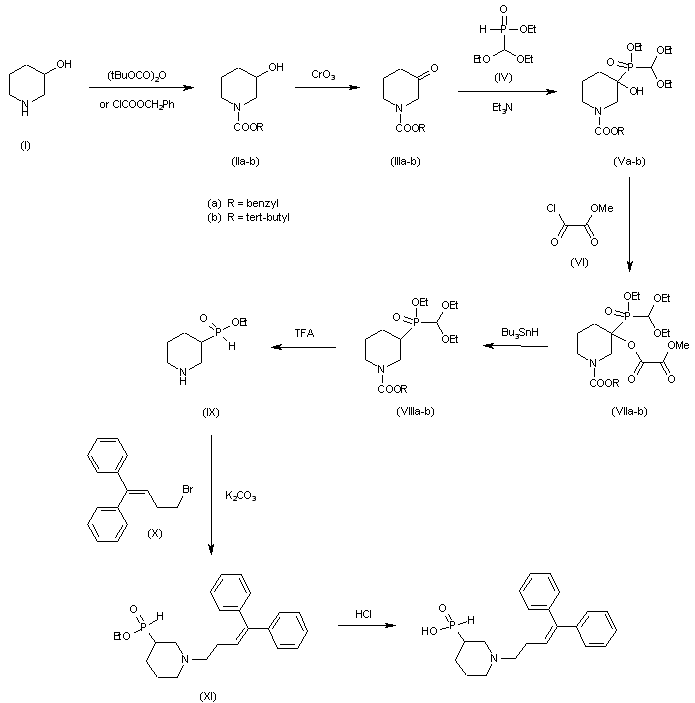 The protection of 3-piperidinol (I) with tert-butoxycarbonyl anhydride or benzyloxycarbonyl chloride gives the corresponding protected piperidine (II), which is oxidized with CrO3 and acetic anhydride in pyridine yielding the piperidinone (III). The condensation of (III) with phosphinate (IV) and triethylamine at 100 C affords the alpha-hydroxyphosphinate (V), which is acylated with methoxalyl chloride (VI) and DMAP giving the methoxalyl ester (VII). The reduction of (VII) with tributyl in hydride and AIBN yields the protected phophinate (VIII), which is deprotected with trifluoroacetic acid affording (IX) with its free NH group. The alkylation of (IX) with 4,4-diphenyl-3-butenyl bromide (X) provides the alkylated piperidinephosphinate (XI), which is finally hydrolyzed with refluxing 6M HCl.