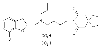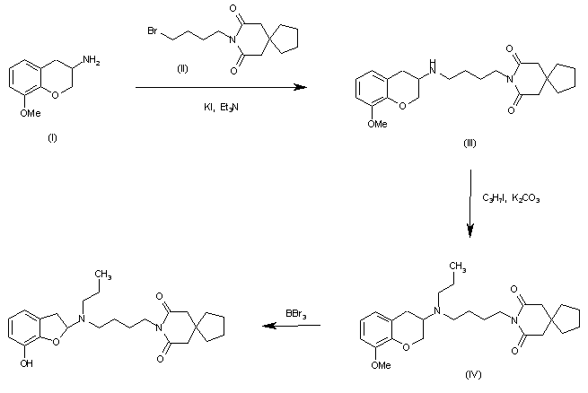 The condensation of 8-methoxy-3,4-dihydro-2H-1-benzopyran-3-amine (I) with 8-(4-bromobutyl)-8-azaspiro[4.5]decane-7,9-dione (II) by means of KI and triethylamine in ot DMF gives the secondary amine (III), which is alkylated with propyliodide and K2CO3 in hot DMF affording the tertiary amine (IV). Finally, this compound is treated with BBr3 in refluxing dichloromethane.
