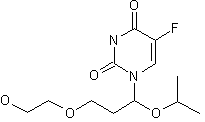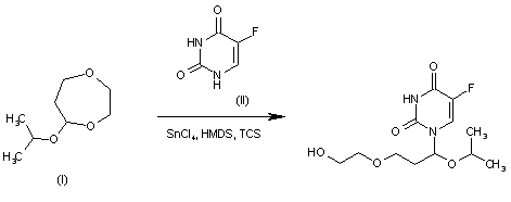 By reaction of 5-isopropoxy-1,4-dioxepane (I) with 5-fluorouracil (II) by means of SnCl4, hexamethyldisilazane (HMDS) and trimethylchlorosilane (TCS) in acetonitrile.