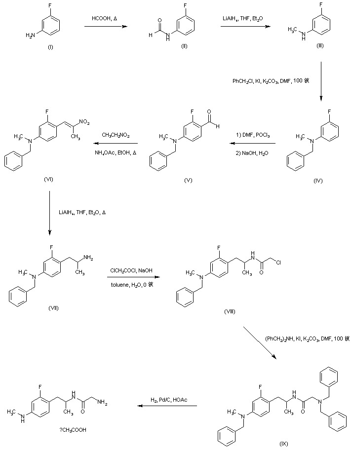 Reaction of 3-fluoroaniline (I) with formic acid gave formanilide (II), which was reduced by means of LiAlH4 to afford 3-fluoro-N-methylaniline (III). Further alkylation of (III) with benzyl chloride provided the tertiary amine (IV). Vilsmeier-Haack formylation of (IV) with POCl3 and DMF yielded aldehyde (V), which was condensed with nitroethane in the presence of ammonium acetate to give the 2-nitropropene derivative (VI). After reduction of (VI) to the amine (VII) with LiAlH4, condensation with chloroacetyl chloride afforded chloracetamide (VIII). Subsequent displacement of the chlorine of (VIII) with dibenzylamine yielded the tertiary amine (IX). Finally, hydrogenolytic debenzylation of (IX) in the presence of Pd/C furnished the title compound.