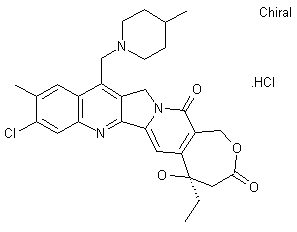 Acylation of 3-chloro-4-methylaniline (VII) with chloroacetonitrile in the presence of BCl3 and Et2AlCl produced the chloroacetophenone (VIII). Subsequent condensation of (VIII) with ethylmalonyl chloride gave amide (IX), which was cyclized to the quinolinone (X) upon treatment with ethanolic NaOEt. Reaction of the quinolinone (X) with POCl3 afforded chloroquinoline (XI). The ester group of (XI) was then reduced to alcohol (XII) by means of diisobutylaluminum hydride. Condensation of (XII) with 4-methylpiperidine (XIII) gave adduct (IV), which was further coupled with pyridinone (VI) under Mitsunobu conditions to yield (Xv). Finally, intramolecular Heck reaction in the presence of palladium diacetate and triphenylphosphine provided the desired pentacyclic compound, which was isolated as the hydrochloride salt.