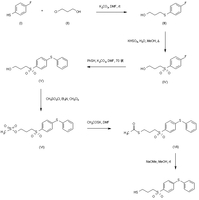 Alkylation of 4-fluorothiophenol (I) with 3-chloropropanol (II) in the presence of K2CO3 in DMF provided thioether (III), which was oxidized to sulfone (IV) using Oxone(R). Fluorine displacement in (IV) with thiophenol and K2CO3 gave phenylsulfanyl derivative (V). The hydroxyl group of (V) was converted to mesylate (VI) and then displaced by potassium thioacetate to afford thioacetate ester (VII). Finally, hydrolysis with methanolic NaOMe furnished the target thiol.