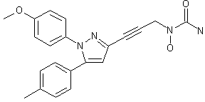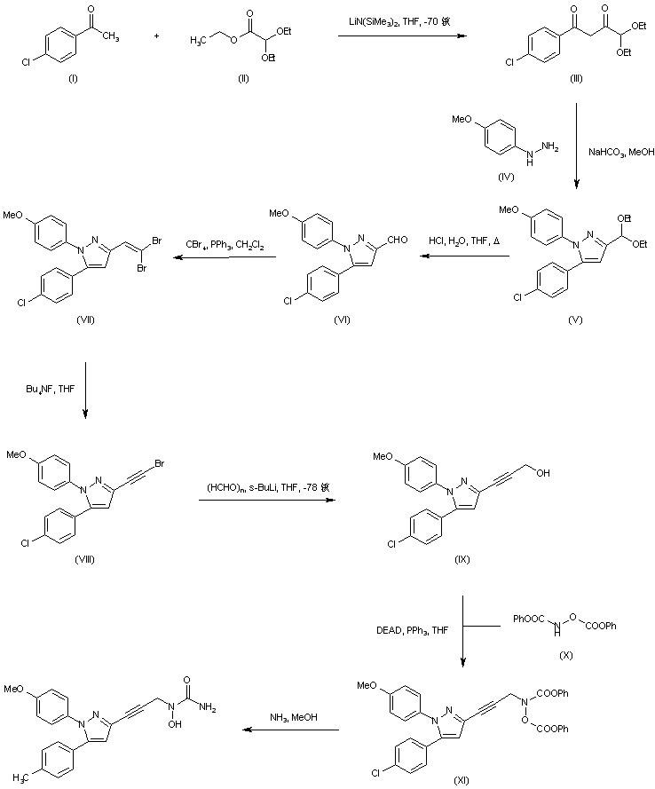 Condensation of 4-methylacetophenone (I) with ethyl diethoxyacetate (II) in the presence of lithium hexamethyldisilazide afforded diketoacetal (III). Formation of pyrazole (V) was accomplished by treatment of (III) with 4-methoxy-phenylhydrazine (IV). Subsequent acid hydrolysis of the diethyl acetal gave aldehyde (VI), which was condensed with carbon tetrabromide using triphenyl phosphine to furnish dibromoethylene compound (VII). Elimination of HBr in (VII) by treatment with tetrabutylammonium fluoride produced bromo-acetylene (VIII). After lithium-bromine exchange, addition of paraformaldehyde yielded the propargyl alcohol (IX). Further Mitsunobu coupling of (IX) with N,O-bis(phenoxycarbonyl)hydroxylamine (X) gave the N,O-bis-protected N-alkyl hydroxylamine (XI). This was finally converted to the title N-hydroxyurea by treatment with methanolic ammonia.