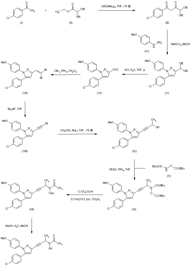 Condensation of 4-chloroacetophenone (I) with ethyl diethoxyacetate (II) in the presence of lithium hexamethyldisilazide afforded diketoacetal (III). Formation of pyrazole (V) was accomplished by treatment of (III) with 4-methoxy-phenylhydrazine (IV). Subsequent acid hydrolysis of the diethyl acetal gave aldehyde (VI), which was condensed with carbon tetrabromide using triphenyl phosphine to furnish dibromoethylene compound (VII). Elimination of HBr in (VII) by treatment with tetrabutylammonium fluoride produced bromoacetylene (VIII). After lithium-bromine exchange, addition of acetaldehyde yielded the propargyl alcohol (IX). Further Mitsunobu coupling of (IX) with N,O-bis(tert-butoxycarbonyl)hydroxylamine (X) gave the N,O-bis-protected N-alkyl hydroxylamine (XI). After Boc deprotection of (XI) by means of trifluoroacetic acid, coupling with acetyl chloride provided the O-acetyl hydroxamic acid (XII). Finally, cleavage of the O-acyl group of (XII) with methanolic NaOH furnished the title compound.