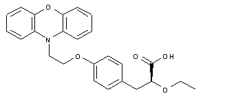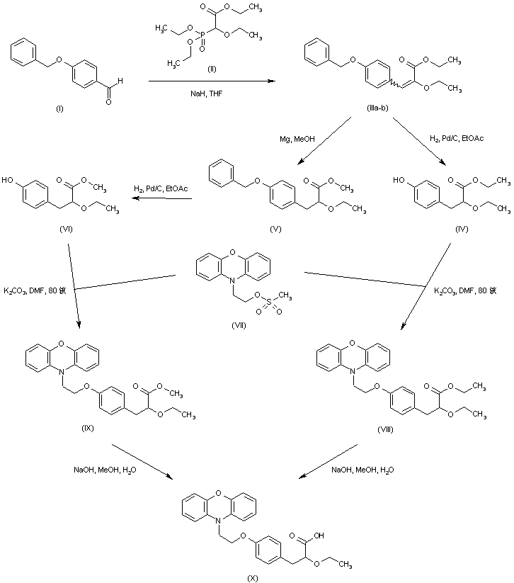Several related procedures have been described for the synthesis of the title compound. The Horner-Emmons reaction of 4-benzyloxybenzaldehyde (I) with triethyl 2-ethoxyphosphonoacetate (II) afforded the unsaturated ester (IIIa-b) as a mixture of E/Z isomers. Simultaneous double-bond hydrogenation and benzyl group hydrogenolysis in the presence of Pd/C furnished phenol (IV). Alternatively, double-bond reduction by means of magnesium in MeOH was accompanied by transesterification, yielding the saturated methyl ester (V). Further benzyl group hydrogenolysis of (V) over Pd/C gave phenol (VI). The alkylation of phenols (IV) and (VI) with the phenoxazinylethyl mesylate (VII) provided the corresponding ethers (VIII) and (IX), respectively. The racemic carboxylic acid (X) was then obtained by hydrolysis of either ethyl- (VIII) or methyl- (IX) esters under basic conditions.