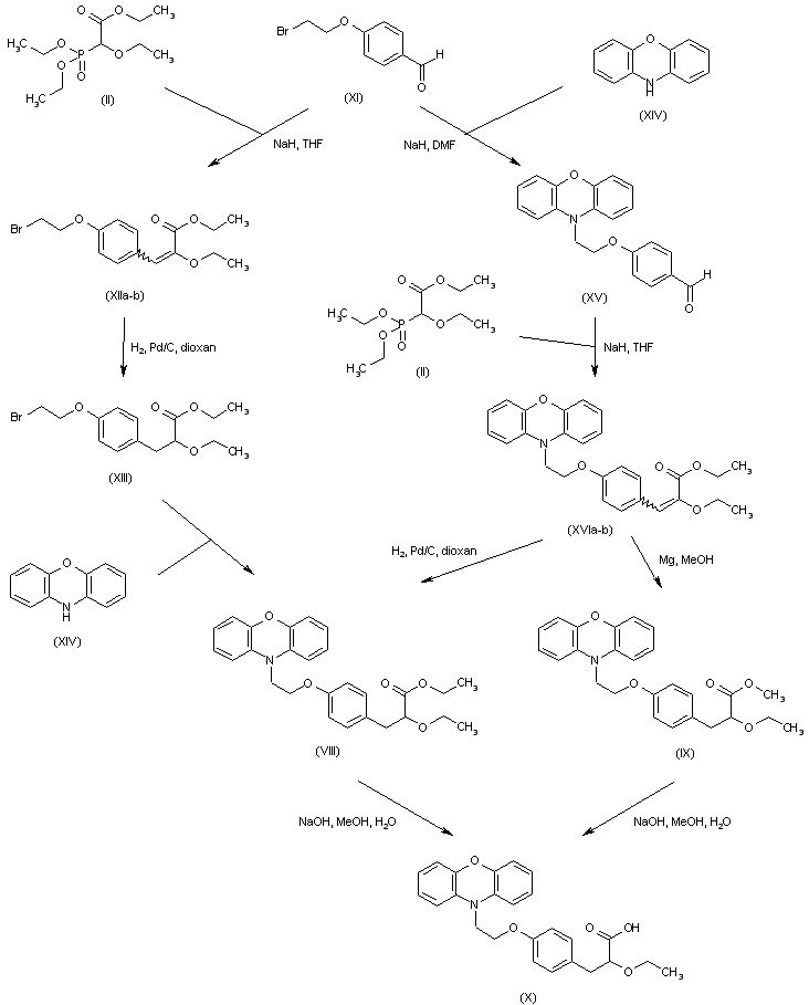 In a related method, 4-(2-bromoethoxy)benzaldehyde (XI) was subjected to a Horner-Emmons reaction with phosphonate (II) to produce the unsaturated ester (XIIa-b), which was further hydrogenated to afford (XIII). Alkylation of phenoxazine (XIV) with bromide (XIII) gave adduct (VIII) (1,2). In a different reaction sequence, bromoaldehyde (XI) was initially condensed with phenoxazine (XIV), producing adduct (XV). This was subjected to Horner-Emmons condensation with (II) to give the unsaturated ester (XVIa-b), which was then hydrogenated to (VIII). Alternatively, double-bond reduction of (XVI) by means of Mg in MeOH gave rise to the transesterified methyl ester (IX). Ester hydrolysis as above provided acid (X).