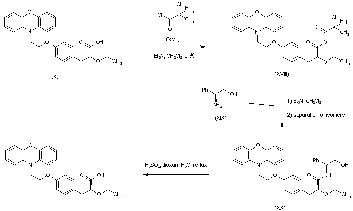 Resolution of the racemic acid (X) was carried out via activation as the mixed anhydride (XVIII) upon treatment with pivaloyl chloride (XVII) and triethylamine. Anhydride (XVIII) was then condensed with (S)-2-phenylglycinol (XIX), producing a separable mixture of diastereomeric amides. Isolation of the desired (S,S)-isomer (XX) by silica gel chromatography, followed by amide hydrolysis under acidic conditions, furnished the target (S)-enantiomer.