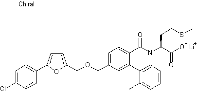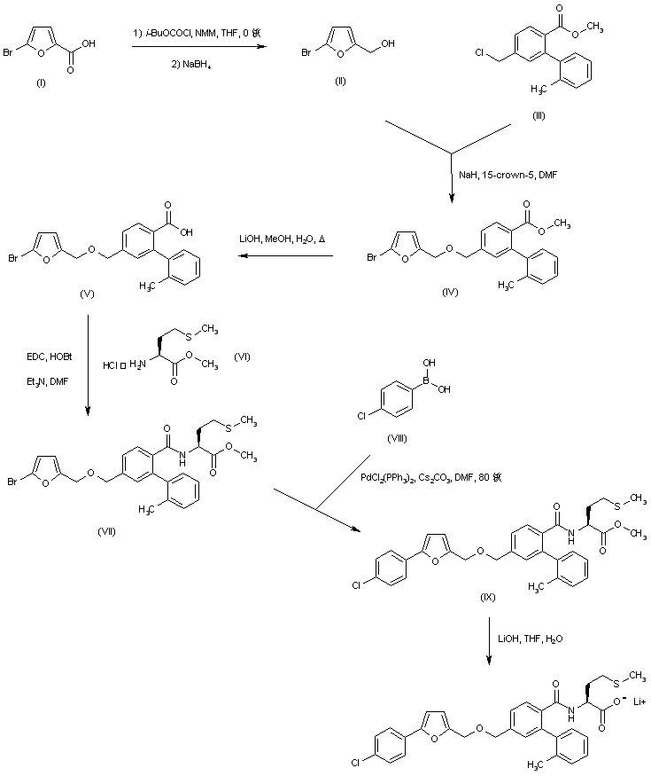 5-Bromo-2-furoic acid (I) was converted to the mixed anhydride with isobutyl chloroformate and then reduced to alcohol (II) using NaBH4. After formation of the sodium alkoxide of (II) with NaH, condensation with chloride (III) in the presence of 15-crown-5 provided ether (IV). Hydrolysis of the methyl ester of (IV), followed by coupling of the resulting carboxylic acid (V) with L-methionine methyl ester (VI) gave amide (VII). Further Suzuki coupling of (VII) with 4-chlorophenyl boronic acid (VIII) produced the aryl-substituted furan (IX). Finally, hydrolysis of the methionine methyl ester of (IX) with LiOH, followed by lyophilization furnished the corresponding lithium carboxylate salt.