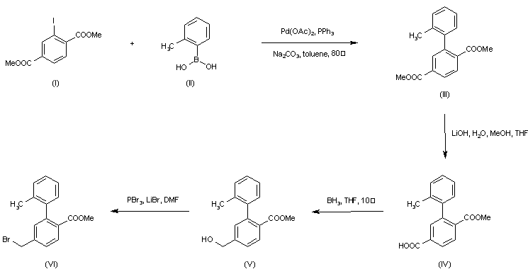 Palladium-catalyzed coupling of dimethyl iodoterephthalate (I) with 2-methylphenylboronic acid (II) afforded biphenyl (III). Hydrolysis of (III) with LiOH yielded mono acid (IV), which was reduced to alcohol (V) using borane in cold THF. Subsequent reaction of (V) with PBr3 furnished the intermediate bromide (VI).