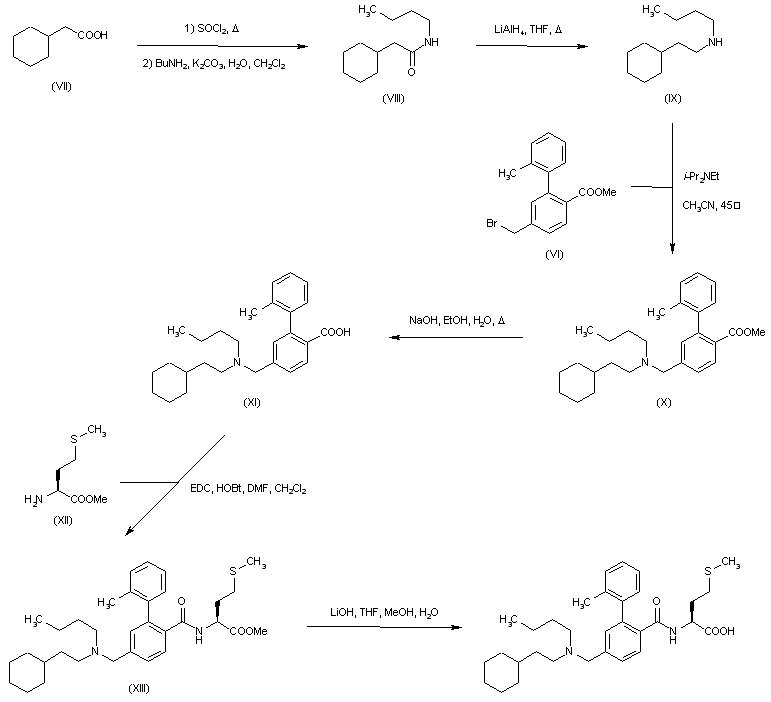 Cyclohexylacetic acid (VII) was converted to acid chloride and then condensed with n-butyl amine to give amide (VIII). Reduction of (VIII) with LiAlH4 afforded secondary amine (IX), which was alkylated with bromide (VI) yielding amino ester (X). After basic hydrolysis of the ester group of (X), the resultant carboxylic acid (XI) was coupled with L-methionine methyl ester (XII) to produce amide (XIII). The methyl ester group of (XIII) was finally hydrolyzed by treatment with LiOH.