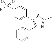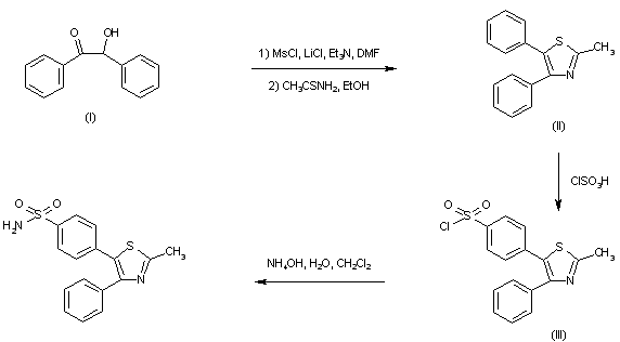 Treatment of benzoin (I) with methanesulfonyl chloride and LiCl, followed by condensation with thioacetamide afforded 2-methyl-3,4-diphenylthiazole (II). Subsequent selective chlorosulfonation at the most reactive 5-phenyl group of (II) provided sulfonyl chloride (III). This was finally converted to the target sulfonamide upon treatment with ammonium hydroxide.