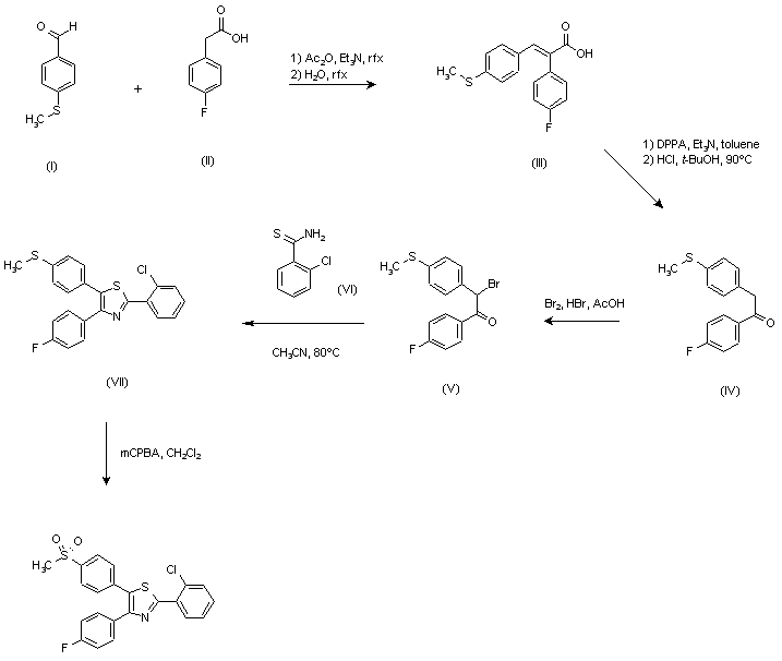 The condensation of 4-(methylsulfanyl)benzaldehyde (I) with 4-fluorophenylacetic acid (II) in refluxing acetic anhydride containing one equivalent of triethylamine, followed by aqueous hydrolysis, provided the diarylpropenoic acid (III). Curtius rearrangement of acid (III) by treatment with diphenylphosphoryl azide in cold toluene, and subsequent hydrolysis of the intermediate isocyanate afforded diarylethanone (IV), which was then brominated in a solution of HBr in acetic acid to give bromoketone (V). The cyclization of this bromoketone with 2-chlorothiobenzamide (VI) in refluxing acetonitrile gave rise to thiazole (VII), and then, oxidation with meta-chloroperbenzoic acid in dichloromethane provided the target sulfone.