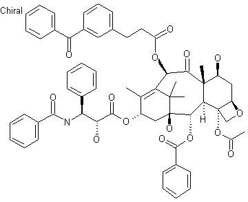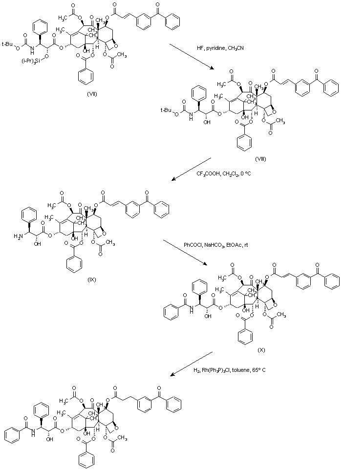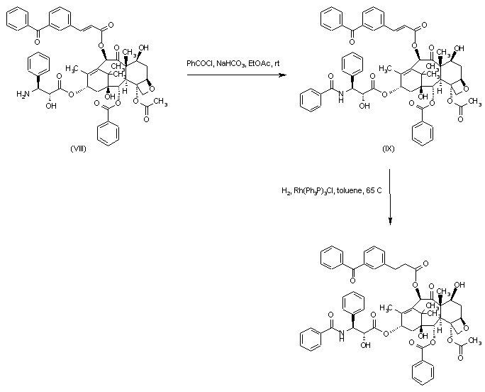 | 合成路线图解说明: The triisopropylsilyl group at position 2' of (VII) was deprotected with HF in pyridine-acetonitrile yielding (VIII), and the Boc group was further removed with trifluoroacetic acid to give (IX). Then, benzoylation of the 3'-amino group of (IX) with benzoyl chloride provided benzamide (X). Finally, hydrogenation of the cinnamyl double bond of (X) in the presence of Wilkinson's catalyst furnished the target compound. |
