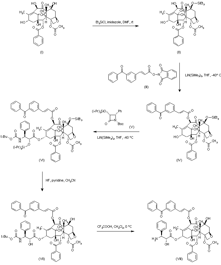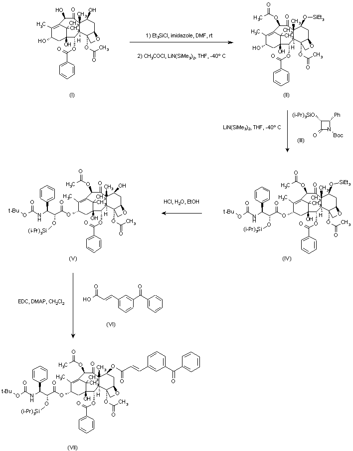| 合成路线图解说明: Selective protection of the 7-hydroxyl group of deacetylbaccatin (I) with triethylsilyl chloride provided silyl ether (II), which was acetylated at position 10 using acetyl chloride and lithium hexamethyldisilazide. Further coupling of (II) with beta-lactam (III) gave (IV), which by selective removal of the 7-silyl group with 0.1 N HCl gave 10-acetyl-2'-(triisopropylsilyl)docetaxel (V). This was condensed with benzoylcinnamic acid (VI) employing EDC and DMAP to afford ester (VII). |