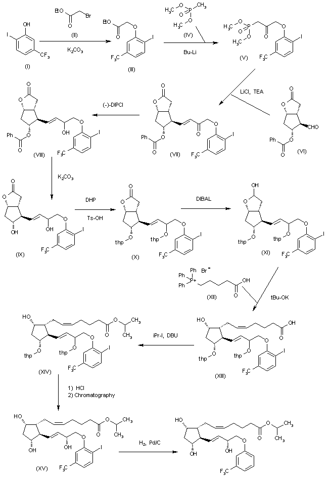 The alkylation of 2-iodo-5-(trifluoromethyl)phenol (I) with ethyl 2-bromoacetate (II) and K2CO3 in acetone gives the phenyl ether (III), which is condensed with the phosphonate (IV) by means of BuLi in THF to yield the ketophosphonate (V). The condensation of the Corey aldehyde (VI) with phosphonate (V) by means of ClLi and TEA in THF affords the ketonic intermediate (VII), which is reduced with (-)-chlorodiisopinocampheylborane [(-)-DIPCl] in THF to produce C-15 hydroxy epimer predominantly with the desired stereochemistry (VIII).The hydrolysis of the benzoate group of (VIII) with K2CO3 in methanol gives the dihydroxylactone (IX), which is protected with DHP and Ts-OH in dichloromethane to yield the bis-tetrahydropyranyl ether (X). The lactone group of (X) is reduced with DIBAL in THF to yield the lactol (XI), which is submitted to a Wittig condensation with 4-carboxybutyltriphenylphosphonium bromide (XII) by means of tBu-OK in THF to afford the carboxylic acid (XIII). The esterification of (XIII) with isopropyl iodide and DBU in acetone affords the isopropyl ester (XIV), which is deprotected (elimination of the THP protecting groups) with HCl in methanol/water and purified by chromatography (elimination of the unwanted C15-epimer) to afford the precursor (XV). Finally the iodine atom of (XV) is eliminated by hydrogenation with hydrogen over Pd/C in ethyl acetate.