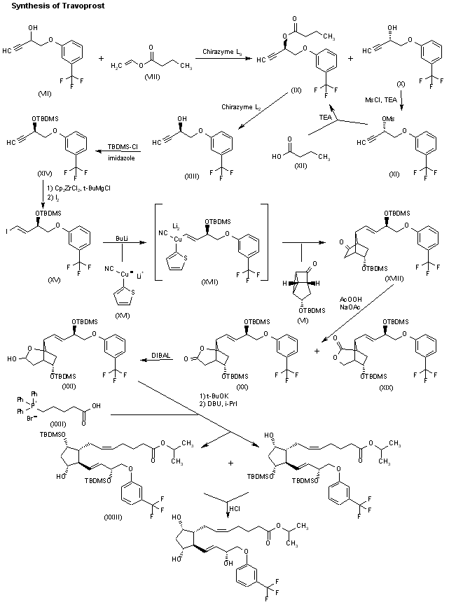 Synthesis of the alkenyl cuprate (XVII): Enzymatic acylation of the racemic acetylenic alcohol (VII) with vinyl butyrate (VIII) by means of Chirazyme L9 gives a mixture of the ester (R)-(IX) and the alcohol (S)-(X). Reaction of this mixture with Ms-Cl and TEA yields a mixture of ester (R)-(IX) and the mesylate (S)-(XI). Treatment of this mixture with butyric acid and TEA results in the acylation of mesylate (S)-(XI) with optical inversion, providing pure ester (R)-(IX). Enzymatic hydrolysis of (R)-(IX) with Chirazyme L2 affords the enantiomerically pure alcohol (R)-(XIII). Silylation of alcohol (XIII) with TBDMS-Cl and imidazole gives the silyl ether (XIV), which is iodinated with Cp2ZrCl2 and I2 to yield the iodovinyl derivative (XV). Finally, the reaction of compound (XV) with the lithium cuprate (XVI) 璸repared by lithiation of thiophene with BuLi followed by treatment with copper (I) cyanide?affords the alkenyl cuprate (XVII). Condensation of the alkenyl cuprate (XVII) with the tricyclic ketone (VI) in toluene provides the bicyclic ketone (XVIII), which is submitted to a Baeyer-Villiger oxidation with peracetic acid to give a mixture of the regioisomeric lactones (XIX) and (XX). The minor and unwanted regioisomer (XIX) is selectively hydrolyzed by treatment with aqueous Na2CO3 and separated by crystallization. Reduction of lactone (XX) with DIBAL in toluene gives lactol (XXI), which is submitted to a Wittig condensation with (4-carboxybutyl)triphenylphosphonium bromide and t-BuOK in THF, followed by esterification with isopropyl iodide and DBU, yielding a mixture of the monosilylated compounds (XXIII) and (XXIV) due to migration of the silyl group on the cyclopentane ring. Finally, this mixture is deprotected with HCl in isopropanol.