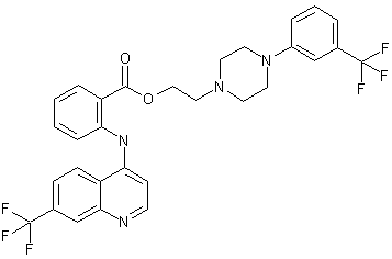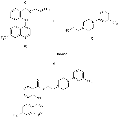 By transesterification of allyl 2-(7-trifluoromethyl-4-quinolinylamino)benzoate (I) with 2-[4-(m-trifluoromethylphenyl)-1-piperazinyl]ethanol (II) in refluxing toluene.