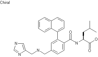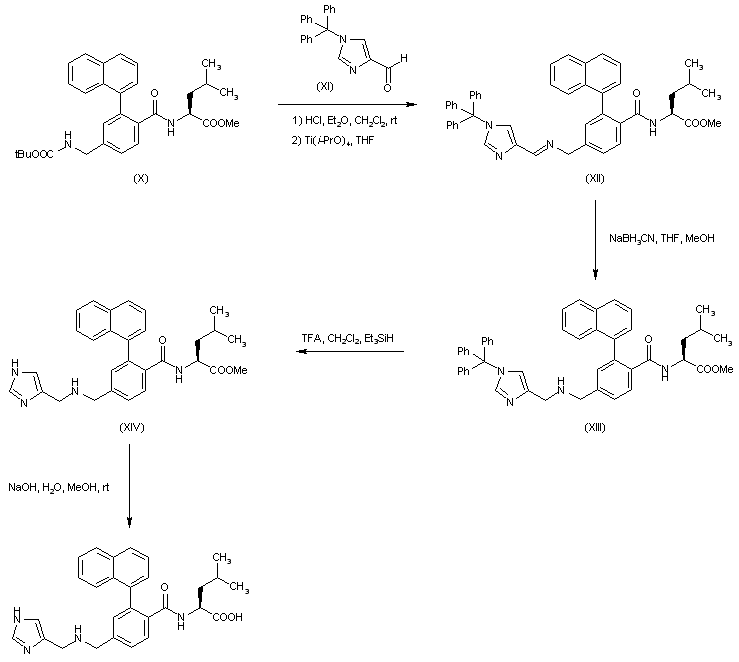 Further acidic treatment of compund (X) regenerated the amine, which was condensed with the imidazole aldehyde (XI) in the presence of titanium isopropoxide as the water scavenger to give imine (XII). This was reduced to amine (XIII) using NaBH3CN. Finally, the title compound was obtained after acid cleavage of the trityl group of (XXXIII), followed by hydrolysis of the resulting ester (XIV).