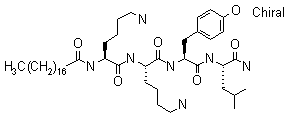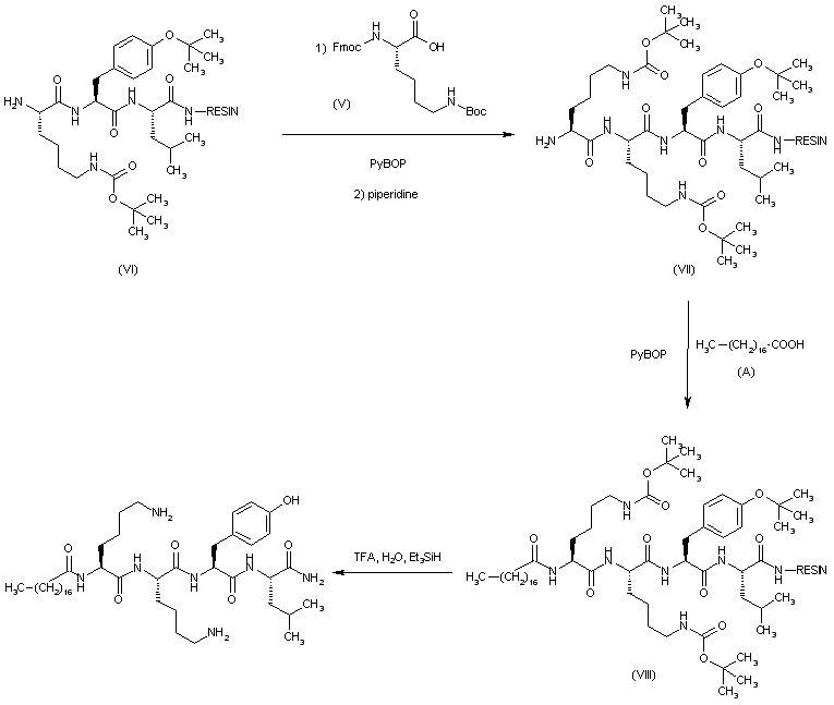 Peptide resin (VII) was then coupled with stearic acid to yield (VIII). Finally, the target peptide amide was deprotected and cleaved from the resin by means of a mixture of trifluoroacetic acid, water and triethylsilane.