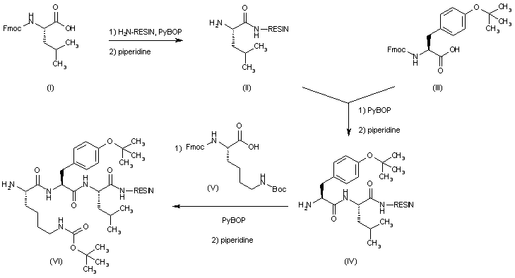 The solid-phase method of peptide synthesis, with an ABIMED AMS 422 synthesizer and a Rink amide resin have been used. N-Fmoc-L-Leucine (I) was attached to Rink amide resin using benzotriazol-1-yloxytripyrrolidinophosphonium hexafluorophosphate as the coupling reagent, and the Fmoc protecting group was subsequently removed to afford resin (II). Further coupling and deprotection cycles with N-Fmoc-L-tyrosine(O-t--Bu) (III), N-Fmoc-N-Boc-L-lysine (V) and again N-Fmoc-N-Boc-L-lysine (V) provided peptide resins (IV), (VI) and (VII), respectively.