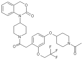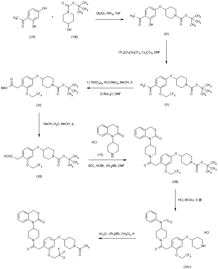 Regioselective Mitsunobu condensation of 2',4'-dihydroxyacetophenone (VII) with N-Boc-4-piperidinol (VIII) afforded ether (IX). The 2'-hydroxyl group of (IX) was then alkylated with 2,2,2-trifluoroethyl trifluoromethanesulfonate in the presence of Cs2CO3 to give (X). Oxidative rearrangement of the acetophenone (X) employing thallium trinitrate and trimethyl orthoformate generated the phenylacetic ester (XI), which was hydrolyzed to acid (XII) with NaOH in aqueous MeOH. Subsequent EDC-mediated coupling of (XII) with piperidine intermediate (VI) yielded amide (XIII). The N-Boc group of (XIII) was cleaved using HCl in EtOAc, and the secondary amine (XIV) was acylated with acetic anhydride in the presence of diisopropyl ethylamine to afford the target acetamide.