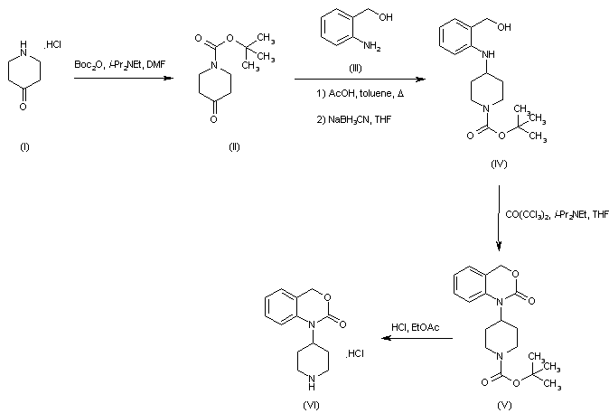 4-Piperidinone hydrochloride (I) was protected as the tert-butyl carbamate (II) using Boc2O and diisopropyl ethylamine. Condensation of (II) with 2-aminobenzyl alcohol (III) in boiling toluene, followed by reduction with sodium cyanoborohydride gave secondary amine (IV). Subsequent cyclization of (IV) in the presence of triphosgene and diisopropyl ethylamine produced the benzoxazinone (V), from which the Boc group was removed with HCl in EtOAc to yield intermediate (VI).