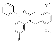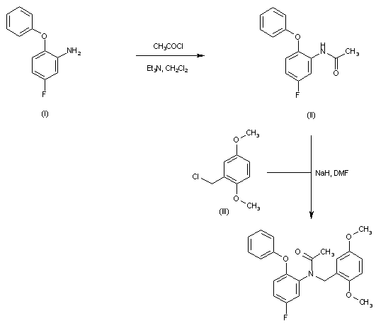 5-Fluoro-2-phenoxyaniline (I) was acylated with acetyl chloride and triethylamine to afford acetamide (II). Alkylation of the amide N by 2,5-dimethoxybenzyl chloride (III) in the presence of NaH provided the target tertiary amide.