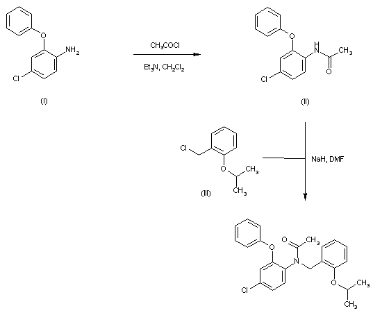 4-Chloro-2-phenoxyaniline (I) was acylated with acetyl chloride and triethylamine to afford acetamide (II). Alkylation of the amide N of (II) by 2-isopropoxybenzyl chloride (III) in the presence of NaH provided the target tertiary amide.