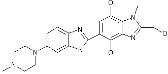 | 合成路线图解说明: Methylation of (hydroxymethyl)benzimidazole (I) at the amino and hydroxyl groups with MeI and NaH provided (II). Subsequent formylation of (II) employing dichloromethyl methyl ether and SnCl4 gave aldehyde (III), which was condensed with the phenylenediamine derivative (IV) in nitrobenzene to produce the bis(benzimidazole) (V). Finally, cleavage of the methyl ethers of (V) with BBr3 in toluene yielded the title compound. |