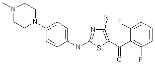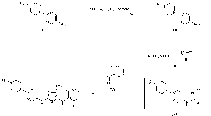 Treatment of 1-(4-aminophenyl)-4-methylpiperazine (I) with thiophosgene and Na2CO3 afforded isothiocyanate (II). Subsequent condensation of (II) with cyanamide in the presence of potassium tert-butoxide, followed by reaction of the resulting intermediate (IV) with 2-chloro-2',6'-difluoroacetophenone (V) produced the title aminothiazole.