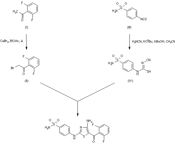 The bromination of 2',6'-difluoroacetophenone (I) using CuBr2 afforded bromoketone (II). Addition of cyanamide to 4-isothiocyanato-benzenesulfonamide (III) in the presence of potassium tert-butoxide generated the intermediate N-cyano isothiourea (IV). Subsequent condensation of (IV) with bromoketone (II) produced the target thiazole derivative.