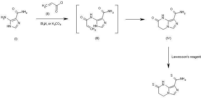 The reaction of 5-amino-1H-imidazole-4-carboxamide (I) with acryloyl chloride (II) by means of Et3N or K2CO3 in acetonitrile gives the intermediate, not isolated compound (III), which cyclizes to the imidazopyrimidine (IV). Finally, this compound is treated with Lawesson's reagent in dioxane or xylene.