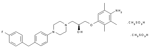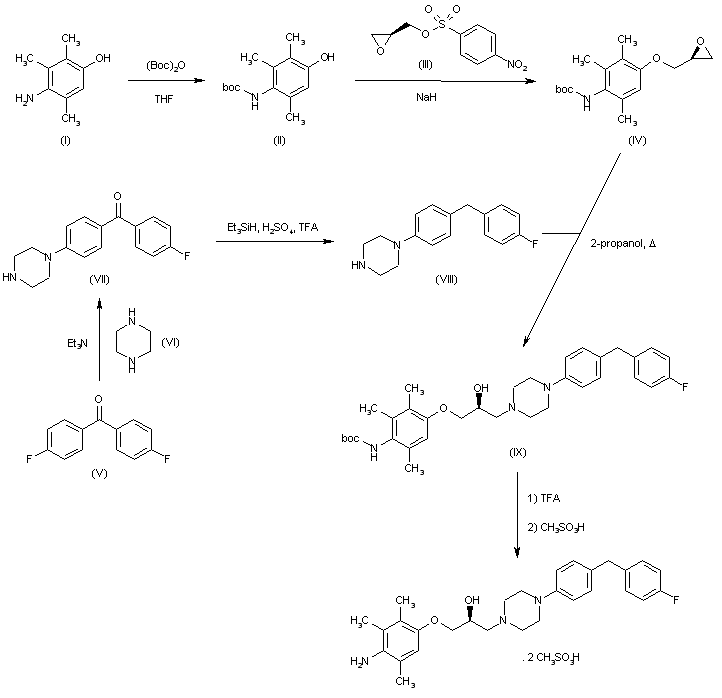 Chemoselective protection of the amino group of 2,3,5-trimethyl-4-aminophenol (I) with di-tert-butyl dicarbonate (Boc)2O in THF gives compound (II), which is then treated with NaH and (S)-glycidyl 3-nitrobenzenesulfonate (III) to yield epoxypropane (IV). On the other hand, treatment of 4,4'-difluorobenzophenone (V) with piperazine (VI) in acetonitrile in the presence of Et3N gives derivative (VII), which is reduced with Et3siH in the presence of H2SO4 and TFA to afford piperazine (VIII). Condensation of epoxypropane (IV) with piperazine (VIII) in refluxing 2-propanol furnishes compound (IX), which is finally converted into the desired product by first removal of the Boc group by exposure to TFA in CH2Cl2, followed by treatment with methanesulfonic acid (MeSO3H).